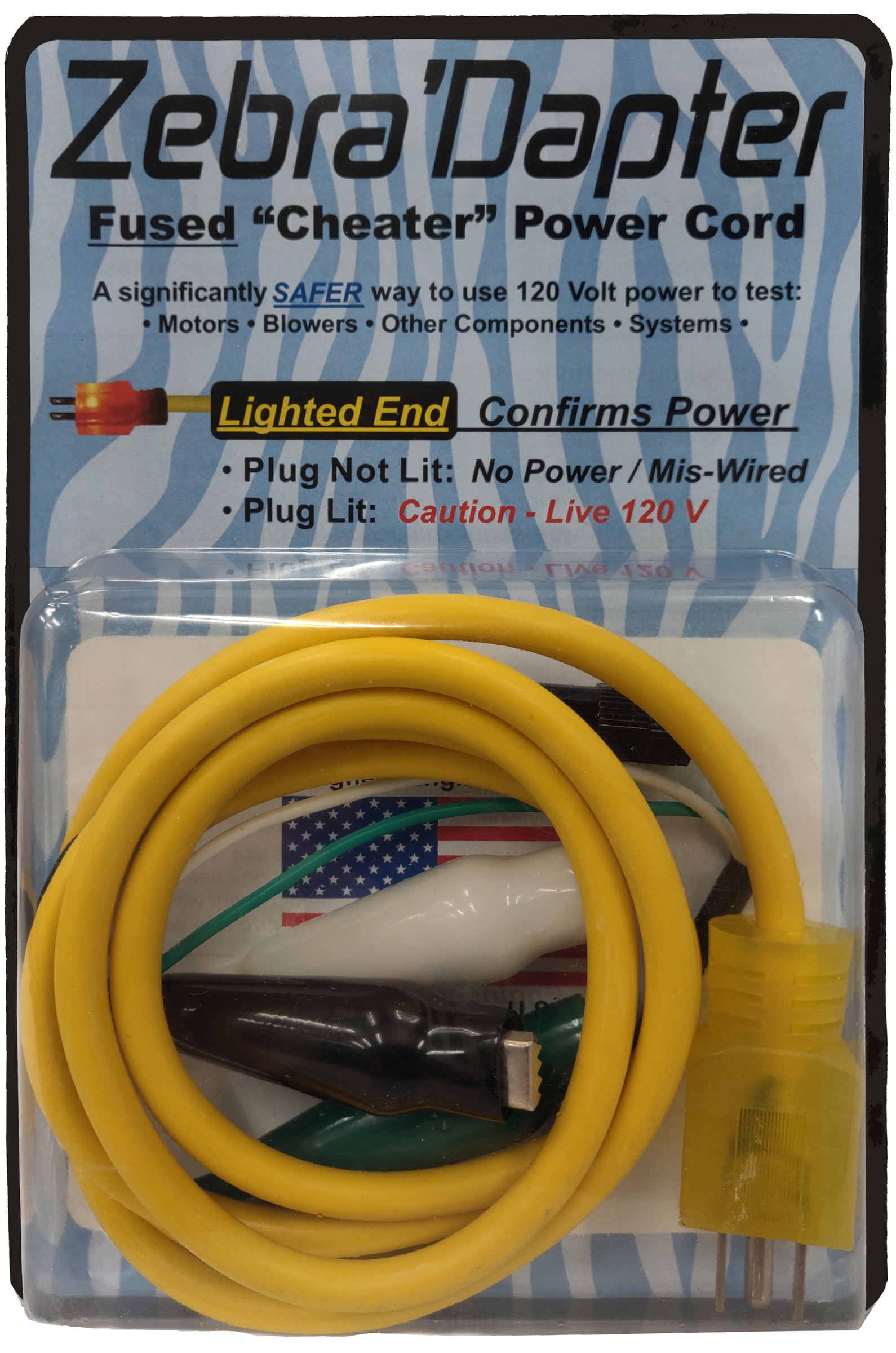 A Zebra'Dapter is a Fused Power Tap Cord (Cheater Cord.) It's standard 120V Plug is lighted to show the voltage level available: