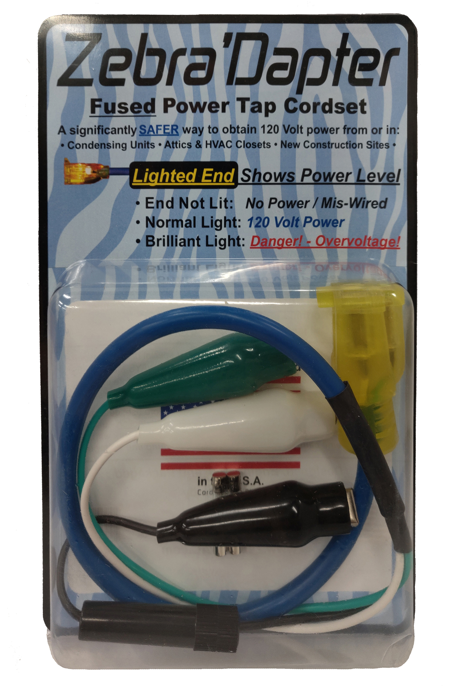 A Zebra'Dapter is a Fused Power Tap Cord (Cheater Cord.) Its standard 120V receptacle is lighted to show the voltage level at the plug: